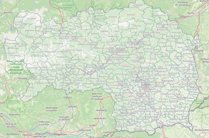 - Darstellung von kirchlichen Grenzen (Pfarre, SR, Region und Einzelpunkt) im Kontext mit anderen Grenzverläufen (z.B. Bezirke)